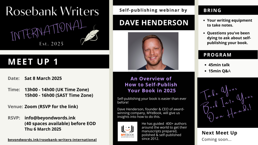 If you’d like a link to the video recording of Rosebank Writers International Meet Up 1 on Self-publishing by Dave Henderson of MYeBook: